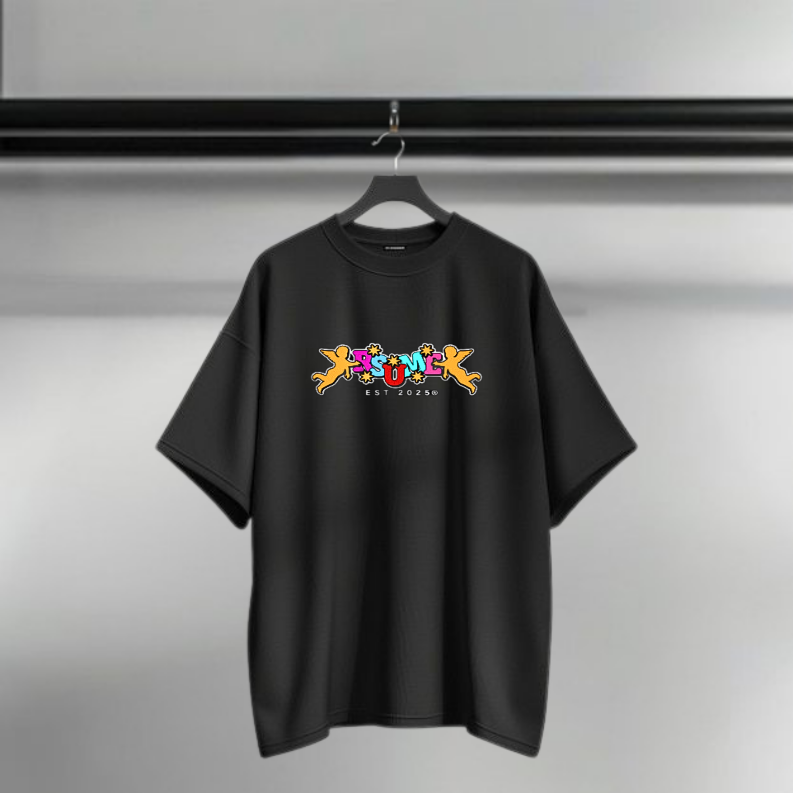 Level up your streetwear game with the Rsume Angels Tee bold, colorful lettering lit with sparks, framed by angel graphics on each side. More than just a shirt, it’s a statThe Rsume Angels Tee brings bold energy to your everyday fit. With vibrant, spark-filled lettering framed by guardian angels, this shirt is more than streetwear, it’s confidence you can wear.