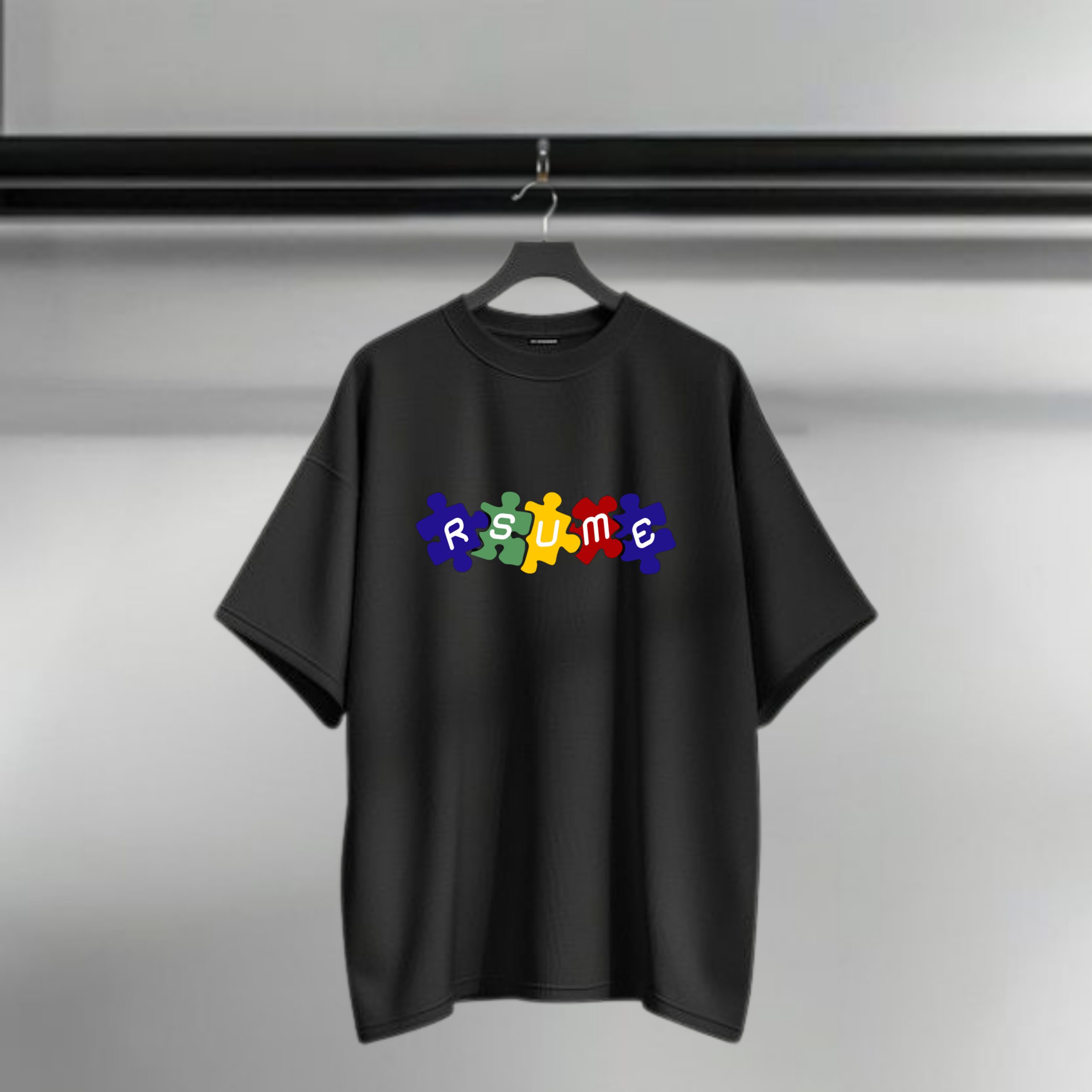 The Rsume Puzzle tee features colorful puzzle pieces forming the brand name. A design that symbolizes growth, self-discovery, and the power of putting your story together.